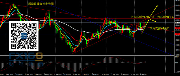 原油:日线看,昨日原油收出中阳线,价格抵达前高49.20位置,今日关注价格能否上破49.20,上破该位置,进一步看向50关口。目前原油上方两大趋势线压制49.30、50,下方支撑位于48关口,价格尚未走出震荡,不过上方50关口被反复测试,向上突破的概率加大。策略上,激进者回落至48.50附近进多,止损50点,目标49.30,进一步目标50;稳健者暂时观望。