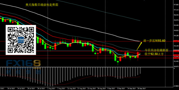 美元指数:昨日美元指数回落91.50后企稳,尾盘收出穿头破脚中阳线,价格开始反弹。从收线看,价格上破4H120期均线是重要的突破,但是收线未有效站上92.50,目前还仅能将美元看做是反弹,而真正确定底部,还需观察本周,甚至是本月收线情况。策略上,按照各交易时段的交易习惯,美联储加息的影响会在亚欧盘市进一步消化。因此,日内美元或进一步反弹,关注今日收线能否站上92.50,若强势上破92.50,后市有望延续反弹,进一步目标93.60。