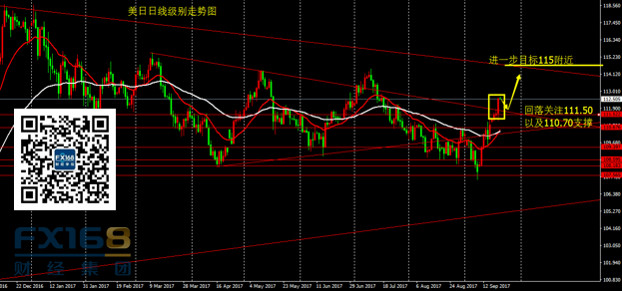 美元兑日元:昨日美元兑日元回踩111.10后大幅上扬,尾盘收出大阳线,价格上破趋势线压制,,尾盘收于112.50,短期走势偏强。目前美日走出小三角形震荡区域,进一步可上看115附近。操作上,今日可关注价格回落至111.50附近做多机会,目标暂设112.50,进一步目标115。