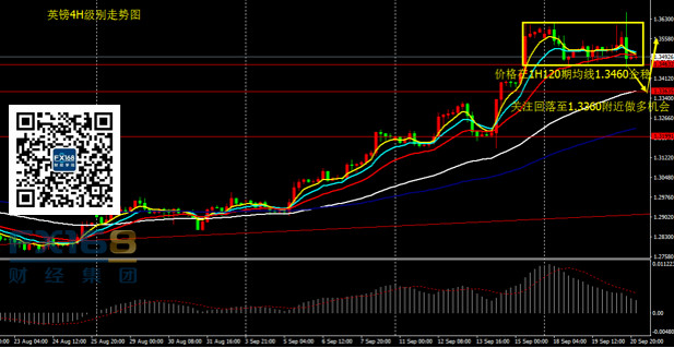 英镑兑美元:日线看,昨日英镑收出射击之星阴线,价格冲高后回落。短线看,回落1H120期均线所在1.3460后企稳,价格未下破震荡区间下沿,表现出英镑的强势。策略上,今日亚欧盘市会继续消化美盘后半场的消息,仍关注价格回落至1.3360(4H60期均线)所在位置支撑及做多机会,目标1.36,止损30点。