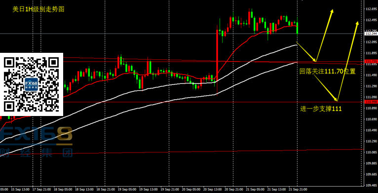 美元兑日元:昨日美日收出顶部螺旋桨阴线,价格出现调整,目前美日走出小三角形震荡区域,正测试大震荡区间的上沿压制,上方空间犹存,可继续逢低买入。操作上,今日激进者可关注价格回落至111.70(1H100期均线)附近做多机会,稳健者关注价格回落至111(4H60期均线)附近做多机会,目标暂设112.50,进一步目标114。