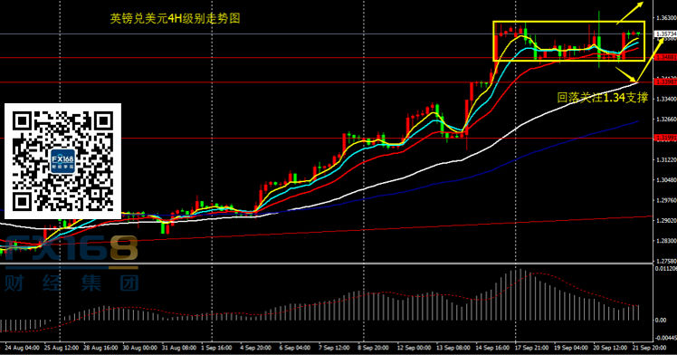 英镑兑美元:日线看,昨日英镑收出中阳线,价格再次拉升,但未能上破1.36压制。目前英镑多头走势明显,做多位置关注两个,一是价格回落至4H60期均线1.34附近进多,另一个是上破1.36后做多,目前走势明确,但点位不佳,盈亏比不划算,可继续等待。