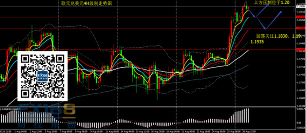 欧元兑美元:昨日欧元跳空高开高走,尾盘收出一根穿头破脚小阳线,价格延续上涨,尾盘收于1.1965;目前欧元已上破之前的1.19压制,实现重大突破,布林轨开口,各均线多头排列,市场情绪偏多。同时,我们还需等待月线收线,若价格站稳60期均线,后市欧元将展开更大幅度的上涨。目前欧元多头情绪占主力,策略上,有多单的投资者可继续持有,没有仓位的关注回落后的做多机会,回落位置关注1.1935、1.19、1.1830,止损设30点,目标设于1.20。