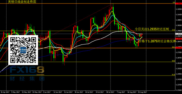 英镑兑美元:日线看,继英镑兑美元收出早晨之星看涨K线组合后,昨日英镑小幅跳空高开,之后价格回落至4H60期均线所在1.2875后企稳反弹,尾盘收出一根小阳线,市场情绪偏多。目前英镑在1.2930附近存在一定压制(道氏前高以及日线级别60期均线压制),价格上破该压制前,不建议追多。策略上,策略上,激进者尝试1.2930附近进空,止损1.2950,目标暂设1.2880;稳健者暂时观望,关注今日收线情况。