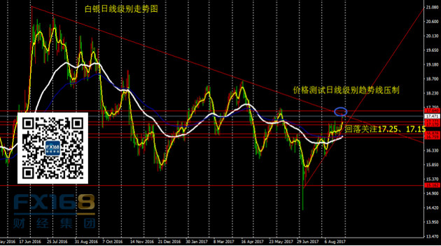 白银:日线看,昨日白银强势上破17.15-17.25压制区域,尾盘收出一根坚挺大阳线。目前白银走势整体偏多。尽管如此,目前价格已抵达长周期趋势线压制附近,不建议追多。策略上,关注价格回落至17.27、17.17附近支撑与做多机会,止损17关口,目标17.50。