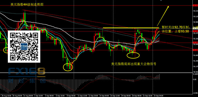 美元指数:昨日美元指数收出小阳线,价格再次测试上周高点92.70,但收线并位上破。从4H级别看,价格突破颈线位置压制,头肩底形态基本形成,若是今日上破92.70,则短期可进一步看向93.50。但上破92.70前,操作上,激进者回落92.20附近做多,稳健者继续以观望为主。