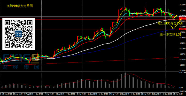 英镑兑美元:日线看昨日英镑收出螺旋桨阴线,价格上冲乏力后回落,之后在4H60期均线附近企稳。目前英镑整体顶部盘整,短期有回落迹象,但中期看涨的观点未变。操作上,昨日我们曾提示激进者可在4H60期均线附近介入多单,有单子在场的,可以4H60期均线1.3430为分界点,止损移至1.3430附近,目标暂时关注1.35;若价格下破1.3430位置,价格有回落1.33的风险,该位置依然是我们可以布局多单的位置。