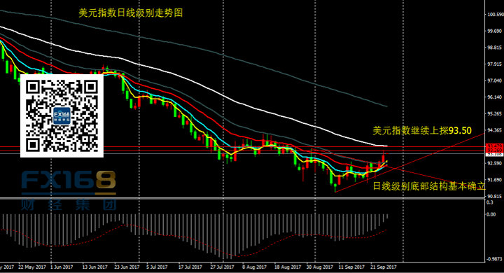 美元指数:昨日美元指数再次收出阳线,价格上破92.70,持稳于93关口。昨日曾分析,4H级别价格突破颈线位置压制,头肩底形态基本形成。经过昨日的反弹,日线级别的底部结构也基本形成,短期可进一步看向93.50。操作上,激进者回落92.50附近做多,稳健者继续以观望为主。关注晚间特朗普税改方案。