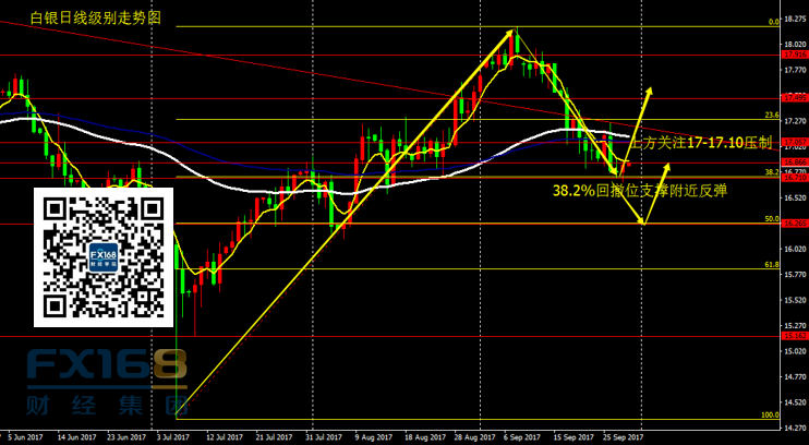 白银:日线看,昨日白银受16.70附近支撑反弹,尾盘收出小阳线,价格跌势暂缓。(昨日曾分析,16.70是2017年7月份以来上行趋势的38.2%回撤位支撑,因此价格在此位置不建议追空。)目前白银在16.70-16.90之间形成盘整区间,若上破16.90,有望进一步反弹至17-17.05。操作上,暂时关注16.70-17.05震荡区域,激进者可于16.70-16.80附近小仓布局多单,目标暂设17;稳健者待价格反弹至17.05附近介入空单,目标16.80。