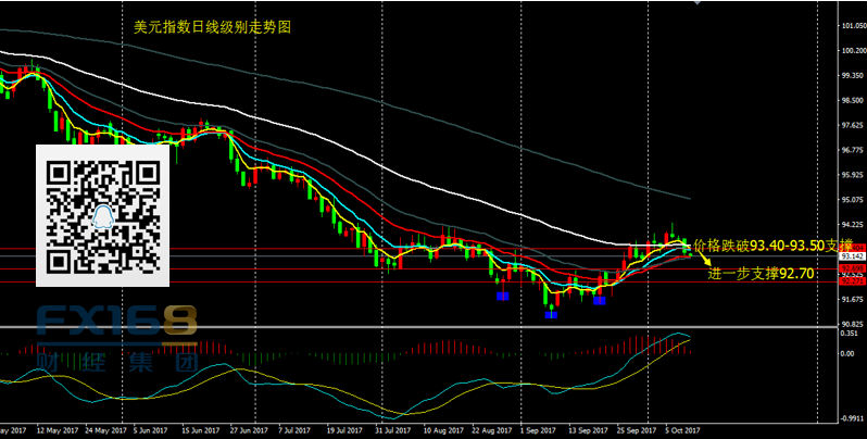 美元指数:昨日美元下破93.40-93.50支撑,价格收于日线级别60期均线的下方,短期内价格进一步回落的风险。按照之前的分析,价格跌破93.40一线,进一步看92.70(左肩以及本轮上行的38.2%回撤位支撑)。