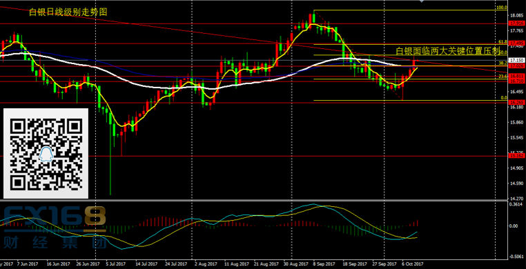白银:日线看,昨日白银收出带小上影线的中阳线,价格上破17关口压制,抵达2016年7月份以来下行趋势线压制附近。目前白银短线偏多,下方16.85形成重要的支撑;但价格上方的17.15(趋势线压制)、17.25(前期高点)的压制效果犹存,追多风险较大。操作上,建议关注价格回落至16.85附近的做多机会,目标暂设17.25.