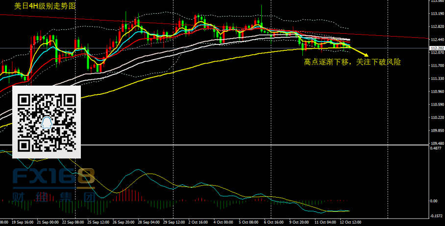 美元兑日元:昨日价格震荡下行,尾盘收出小阴线,目前美日整体仍处于顶部震荡,价格下跌112-112.20支撑明显,但上方60期均线已由之前的支撑变为强压,警惕价格出现下破。操作上,关注4H价格表现,若一根大阴线下破100期均线支撑( 112 附近),可尝试小仓进空,目标111.50。