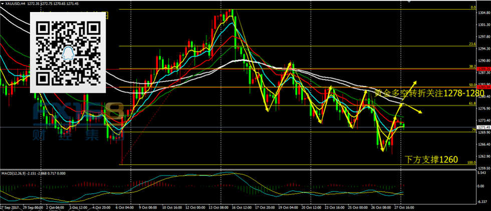 黄金:上周黄金收出十字阴线,价格整体震荡下行;日线看,价格处于61.8%回撤位支撑下方,MACD零轴下方死叉暗示短线情绪仍偏多。4H级别看,目前黄金依然维持有规律的下跌,即每次创新低后价格反弹测试4H昨期均线之后再次下跌,这也是上周我们多次介入空单的一个重要原因。操作上,目前价格处于反弹之中,若有机会再次测试4H60期均线所在1278-1280这一位置,仍是非常好的做空机会,止损1285,目标暂设1270。若价格有效跌破1270这一位置,进一步看向1260.