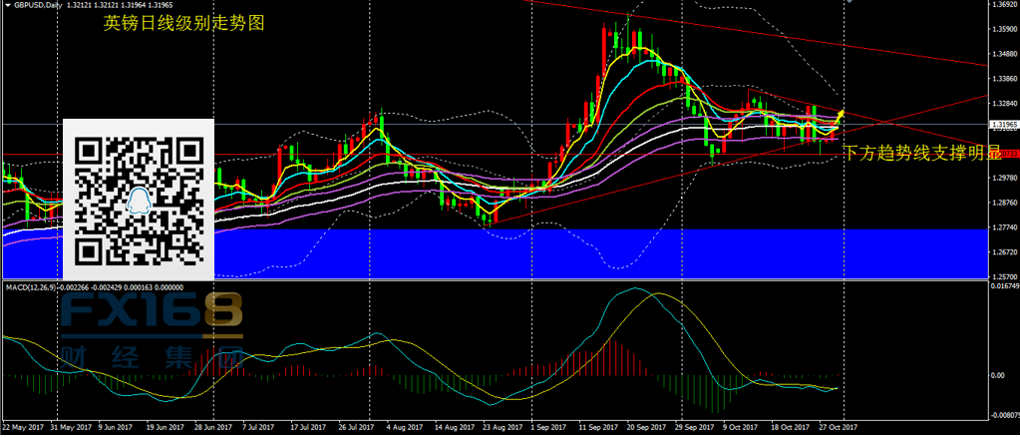 英镑兑美元:昨日英镑依托于趋势线支撑出现反弹,尾盘收出中阴线,MACD能量柱转为红色,但布林轨收口,短线价格较为震荡。目前市场焦点转向本周四英国央行,目前市场有预期认为英国央行或于本次加息,这种概率发生的情况偏小,但预期影响下,使得英镑在利率决议公布前,大跌的概率不大,在会议公布前,英镑或大概率走震荡。目前英镑的走势与上周欧银决议前欧元的走势极为类似,但与欧元不同之处在于,英镑整体走势偏强,未出现顶部背离。操作上,价格跌破1.3070前,不建议做空,而做多需满足价格上破上方的趋势线压制。