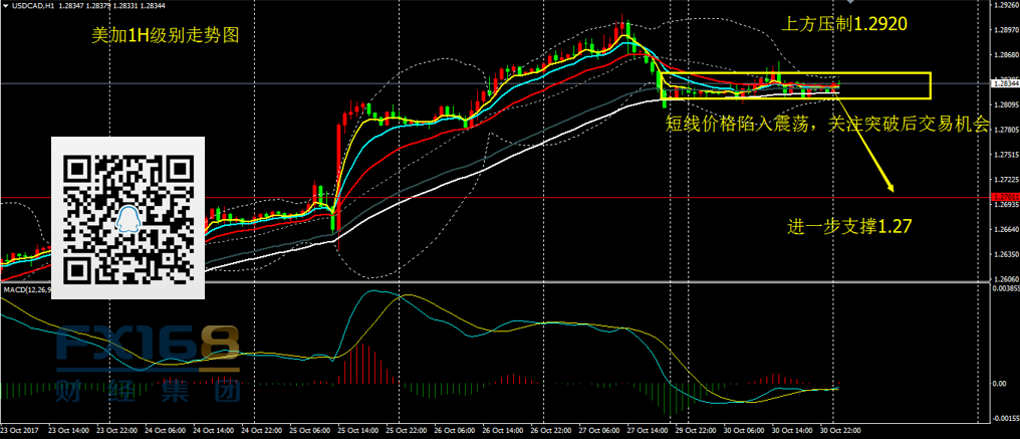 美加:昨日美加收出十字阴线,价格整体维持震荡;4H级别,价格仍处于布林轨中轨支撑之上,但K线表现表明价格走势并不强劲。1H级别能够明显的看出价格目前整体在1.2810-1.2850区间内横盘整理。操作上,今日继续关注1.28-1.2810附近支撑,若这一位置被有效下破,美加有回落1.27的风险,但是价格跌破这一位置之前,不建议做空。最理想的回落做多位置在1.2710,12820这一位置也可以关注,但是在缺乏新的基本面刺激下,美加短线上破周线级别强压制1.2940的可能性不大。