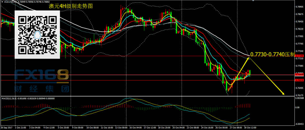 澳元兑美元:日线看,昨日澳元录得反弹小阳线,昨日已分析,短周期的1H以及4H发出反弹信号,因此不宜追空。昨日价格测试0.7680后回落,但之后未能创出新低,而是向上突破,短线价格有进一步反弹的风险。操作上,与昨日思路一致,关注价格反弹0.7730-0.7740附近压制及做空机会,而0.7740这一位置是非常重要的压制和做空机会,若有机会再次触及,可尝试进空。