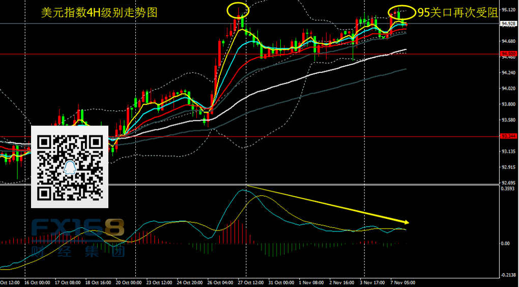 美元指数:昨日美元指数收出小阴线,价格再次测试95关口乏力,之后回落。4H级别看,MACD指标出现顶部形态,能量柱转为绿柱,短线有回落需求。操作上,中线仍看好美元走势,维持低多思路,有多单继续持有,没有仓位的回落94.50-94.60附近布局多单机会,目标上看95,进一步目标96。