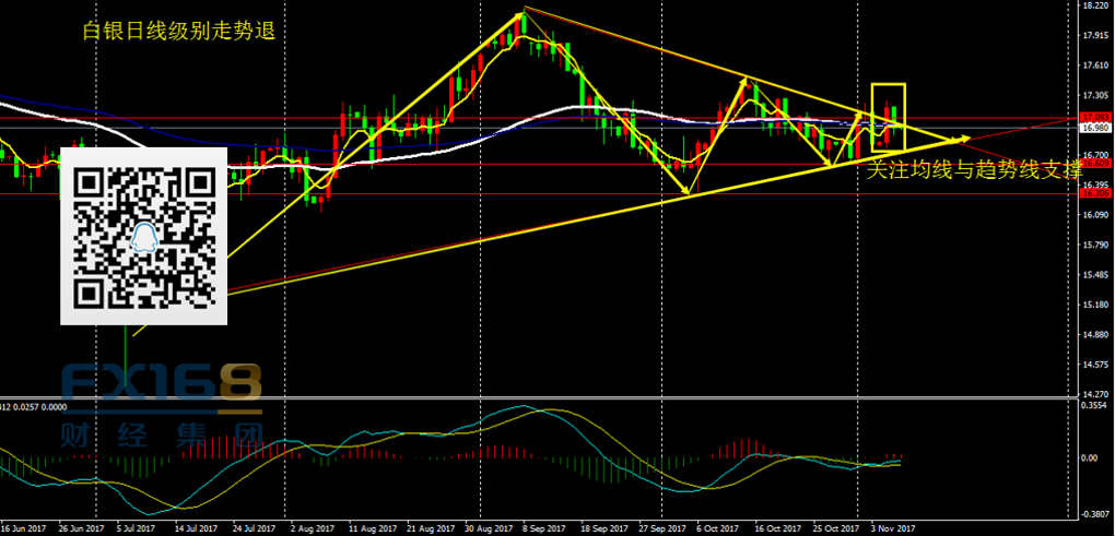 白银:日线看,昨日白银收出中阴线,价格下方60期均线与趋势线支撑强劲;4H级别看,价格受17关口支撑一度上扬至17.20,之后重新回落。整体看,目前白银正在测试之前上破的趋势线支撑,若今日价格再次企稳收阳,短线白银有继续上行的可能,但17.20这一位置是多根日线最高点,压制效果较强。操作上,目前白银仍处于选择方向的时点,昨日激进者回踩17关口位置做多有一波盈利,但空间不大,今日继续关注17.20附近的压制效果,操作上暂时观望。
