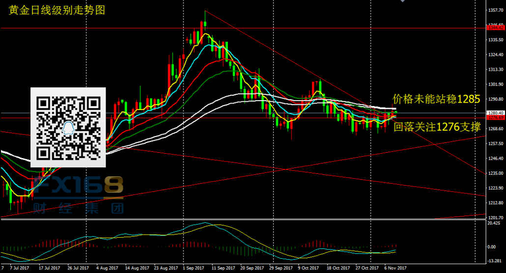 黄金:昨日黄金自1275反弹,价格一度上探1287,之后回落,尾盘收出一根带上影线的小阳线。按照昨天的分析,黄金要想确认这一波的上行需满足价格站稳1285一线,但收线情况暗示上方压制较强,黄金要确认反转仍需耐心等待。目前价格上方1285仍是关键压制,而下方1275-1277成为重要支撑,今日操作需关注这两大位置。操作上,若有1285附近空单的投资者,可止损下移至开仓价附近,重点关注价格回落1278附近的离场机会。没有仓位的激进投资者可待价格回落1277附近后关注做多机会,若配合K反信号,可尝试入场做多。稳健者目前仍以观望为主。