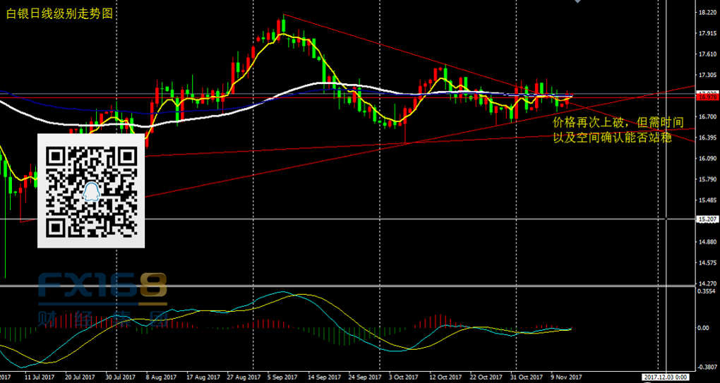 白银:昨日白银收出小阳线,价格再次站上趋势线上方,但同之前突破一样,目前尚不能判断价格为真突破还是假突破。同时价格未能走出16.75-17.25震荡区间,行情仍以震荡为主。操作上,激进者可利用震荡区间高抛低吸,稳健者暂时观望。