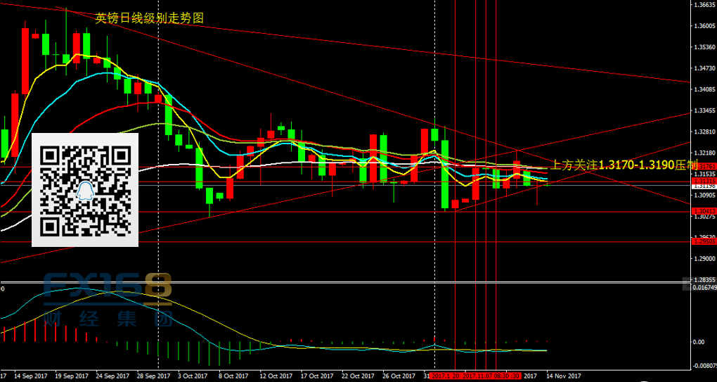英镑兑美元:日线看,昨日英镑下探1.3160后快速反弹,尾盘收出十字阳线。目前价格上方趋势线压制、日线60期均线、4H60期均线压制较强,做多风险较大;而下方1.3060这一位置不破,英镑大幅下跌也难实现。操作上,目前多空都以短线为主,激进者关注价格反抽1.3170-1.3190附近的小仓做空机会,止损30点,目标1.3060,稳健者暂时观望,待价格下破1.3050后再行操作。