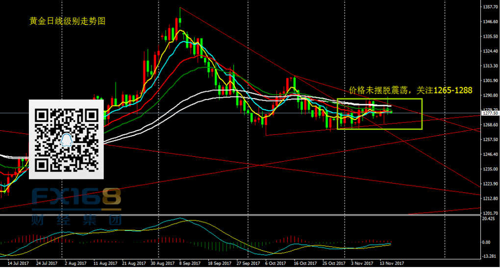 黄金:日线看,昨日黄金收出射击之星阴线,价格再次上探1288-1290,但未能有效突破,随后大幅下行,尾盘仍收于1278附近。前两个交易日构成顶部揉搓线,表明目前价格仍1265-1290维持宽幅震荡,价格方向不明 。操作上,激进者继续利用震荡区间高抛低吸,稳健者待价格突破后再行操作。