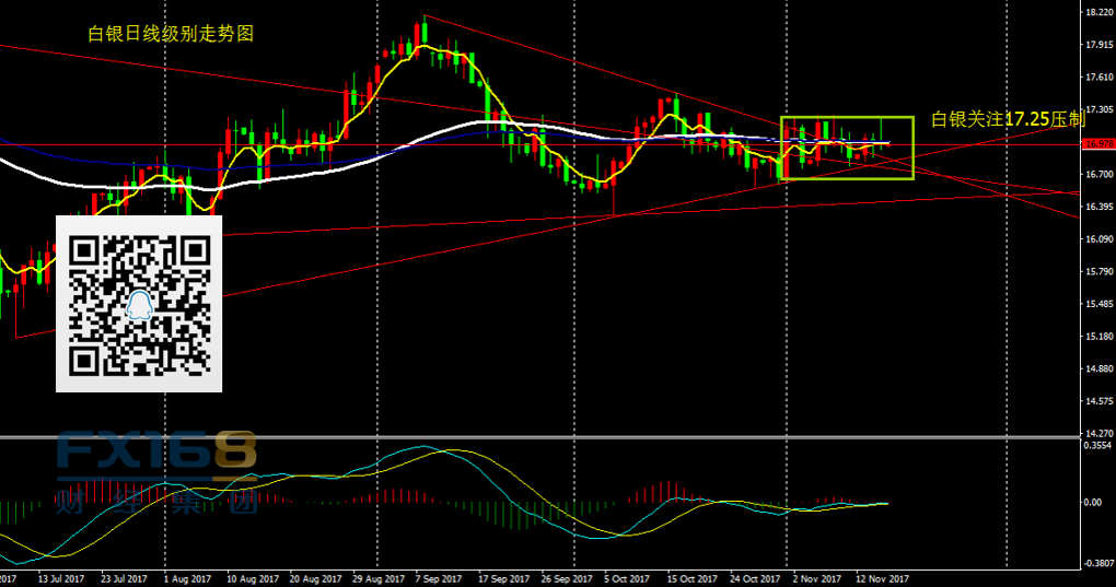 白银:昨日白银再度收出十字阴线,价格上探17.25后回落,目前交投于17关口附近。目前白银多头与空头力量势均力敌,方向不明,上方压制17.25,下方支撑16.85,操作上,建议暂时观望。