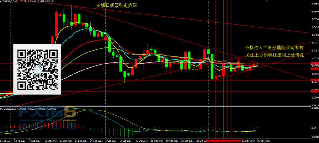 英镑兑美元:昨日英镑收出锤子阳线,价格在1.3135附近企稳反弹,之后一度上探1.3210,最终回落。目前价格上方趋势线压制依然有效,且1.32附近压制较强,不建议做多;而1.3150、1.3140支撑也非常强劲。操作上,近期英镑的操作都依据三角形震荡区间操作短线,目前价格进入三角形末端,多空空间不大,建议暂时观望,等待价格破位。若今日收线价格站上1.32上方,则后市可重新介入多单。而真正确定空头走势需价格跌破1.3050一线。