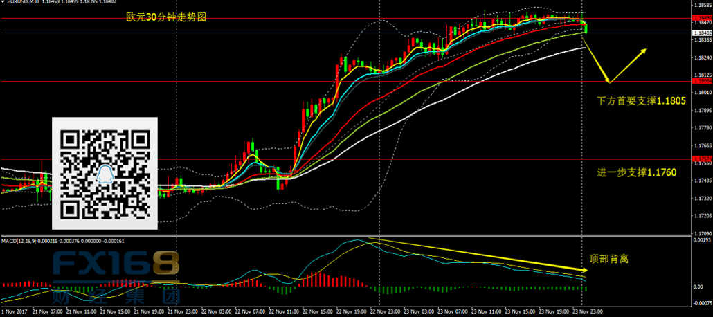 欧元兑美元:昨日欧元收出小阳线,价格延续上行,收盘收于1.1850附近。1.1850-1.1880为重要的压制区域,在缺乏利好支撑的情况下,价格在这一位置涨势乏力。4H价格及指标仍指向价格上行。不过30分钟顶背离预示价格有回落修正的需求。操作上,激进者关注价格回落1.1805附近以及1.1760附近的支撑及做多机会,若有K反信号配合,可尝试进多;稳健者暂时观望,等待本周甚至本月收线后操作(目前价格测试月线级别强压)。