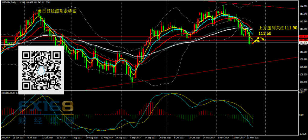 美元兑日元:昨日美日收出十字阴线,价格回落至111附近后小幅反弹,111是周线级别60期均线所在支撑,这一位置的下破情况直接决定了下周我们如何看待美日。30分钟级别价格出现底部背离发出反弹需求,短线价格有上探111.60甚至111.90的风险。操作上,今日关注价格反弹111.60以及111.90附近表现,若有K反信号配合,激进者可尝试进空。稳健者可待本周收线后下周再行交易。