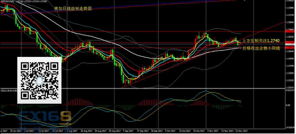 美加:昨日美加收出十字阳线,价格未经反弹直接跌至100期均线1.2670附近;4H级别,昨日在数据影响下价格收出的大阳线令美加企稳反弹,目前价格交投于1.2720附近。若本周价格收于日线级别100期均线1.2670上方,仍不可过分看空美加。操作上,激进者关注价格反弹1.2750附近的表现,若有K反信号配合,可尝试进空,止损30点,目标1.2670;稳健者暂时观望。