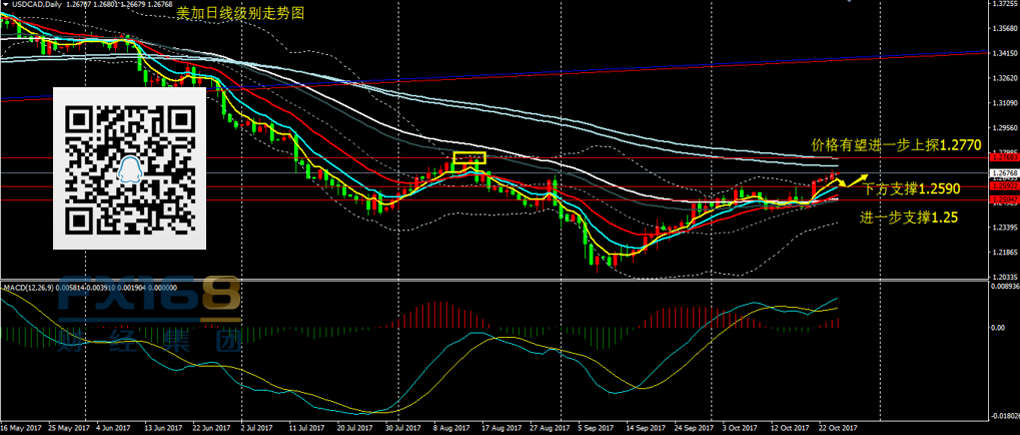 美加:日线看,昨日美继续收阳,价格整体处于缓涨的状态,但涨势稳健。前期1.2590被上破的位置起到重要的支撑,MACD零轴上方金叉,能量柱绿柱转为红柱,市场情绪偏多。操作上,今日在央行利率决议的影响下,料加元的波动会加剧,若本月再次加息或者加行暗示年内会再次加息,基本面利好加元,美加将出现大幅回落,下方支撑看1.25;若没有加息,或者对近期通胀或者经济表示担忧,美加上行趋势不会改变,目标依然看向1.2770。技术面看,价格若有机会回落至1.2590附近,依然可以关注做多机会。