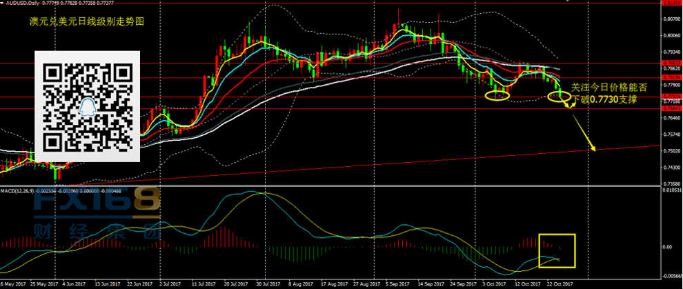 澳元兑美元:日线看,昨日澳元收出光脚阴线,今日受利空数据影响,澳元按抵达前期低点0.7730附近。今日关注这一位置能否下破,下破这一位置,短线澳元会进一步下看0.7680。0.7680是周线级别60期均线的支撑,若这一位置失守,澳元恐下探0.75位置。因此,重点关注本周收线情况。操作上,前期有空单的可以继续持有,关注0.7730的支撑;没有仓位的关注价格反弹0.78附近的做空机会。